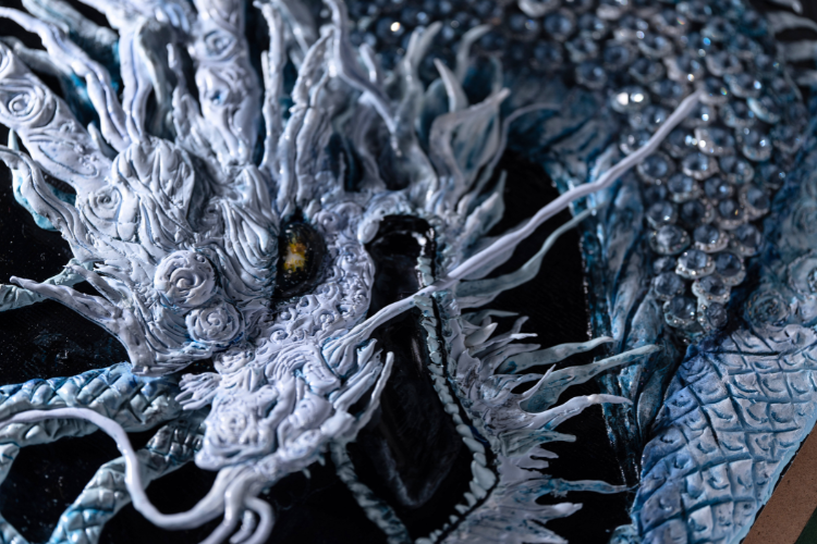 Cloaked in deep blue and white light, the white dragon stands in serene stillness. Its gaze is calm yet piercing, as if watching over the farthest reaches of the galaxy — quietly offering a sense of peace and divine protection to all who behold it.